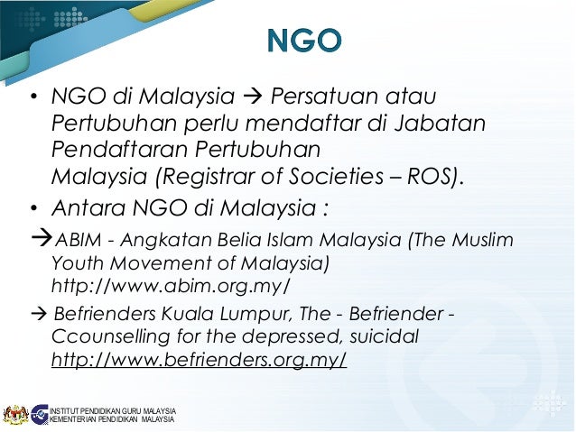 Sebahagian besarnya didaftarkan kepada Pendaftar Pertubuhan ROS sebagai pertubuhan. Baca versi flipbook dari SEJARAH PERKEMBANGAN NGO DI MALAYSIA. Organisasi bukan kerajaan NGO merupakan entiti yang.
